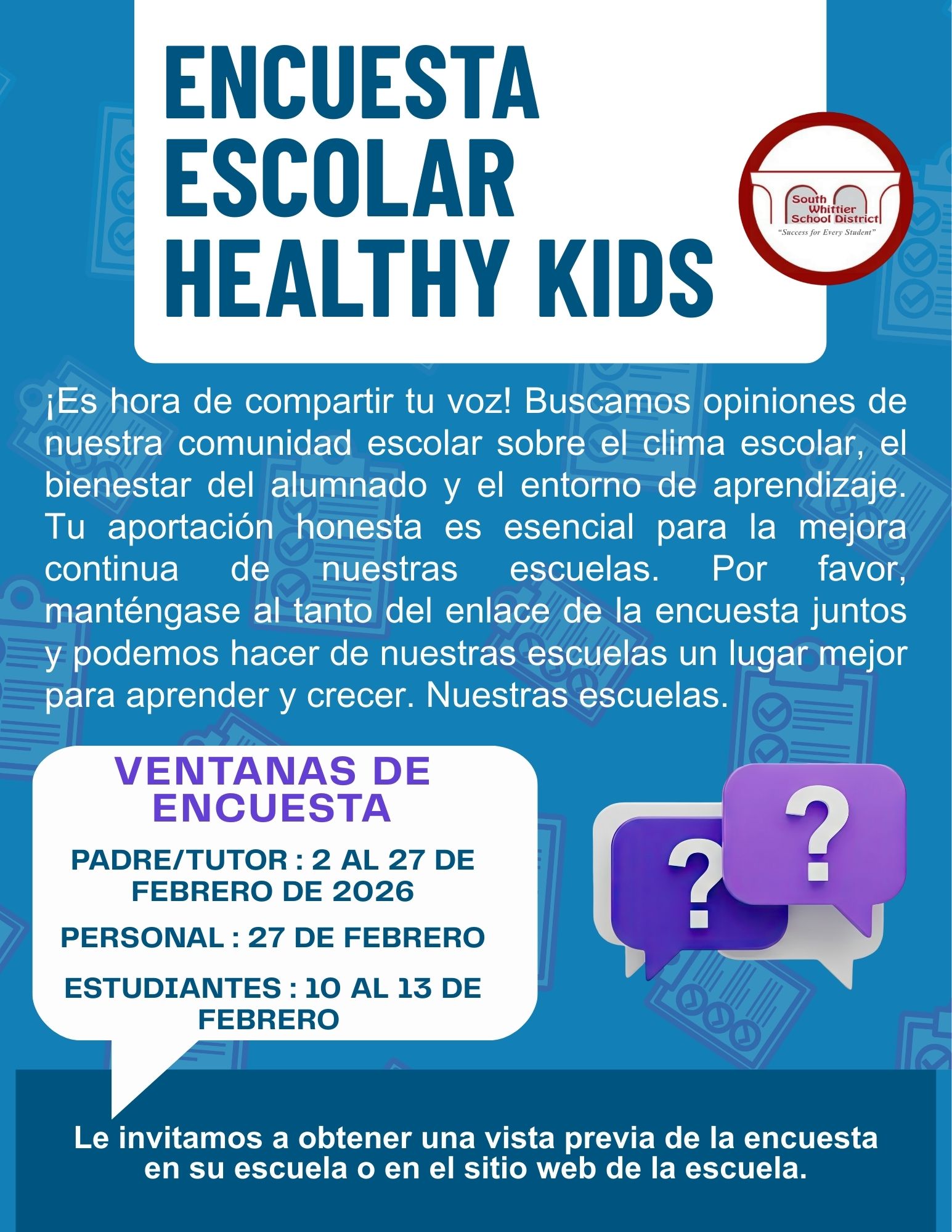 Our middle school students will participate in the California Healthy Kids Survey on February 12, 2026. This anonymous and voluntary survey helps schools better support student health, safety, and well-being. No names are collected, and students may skip any question or stop at any time.